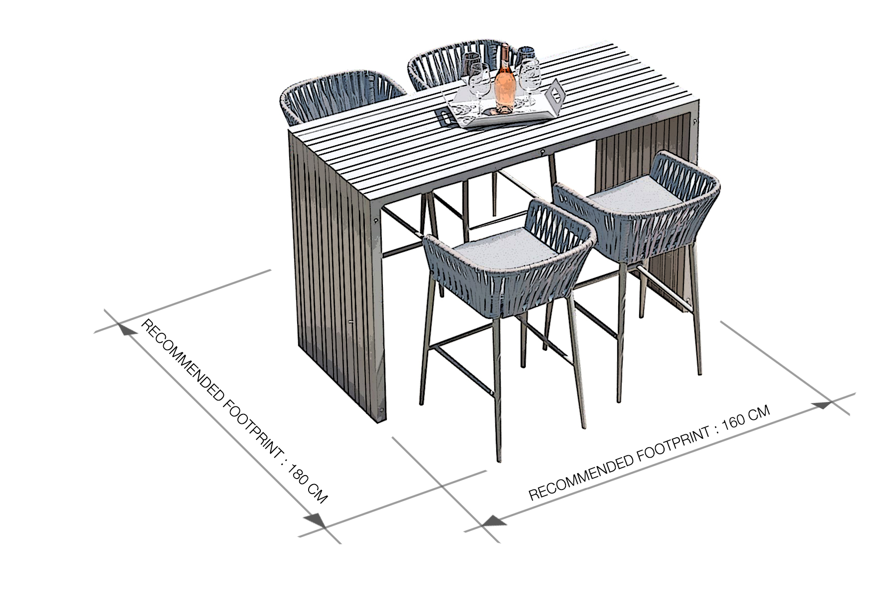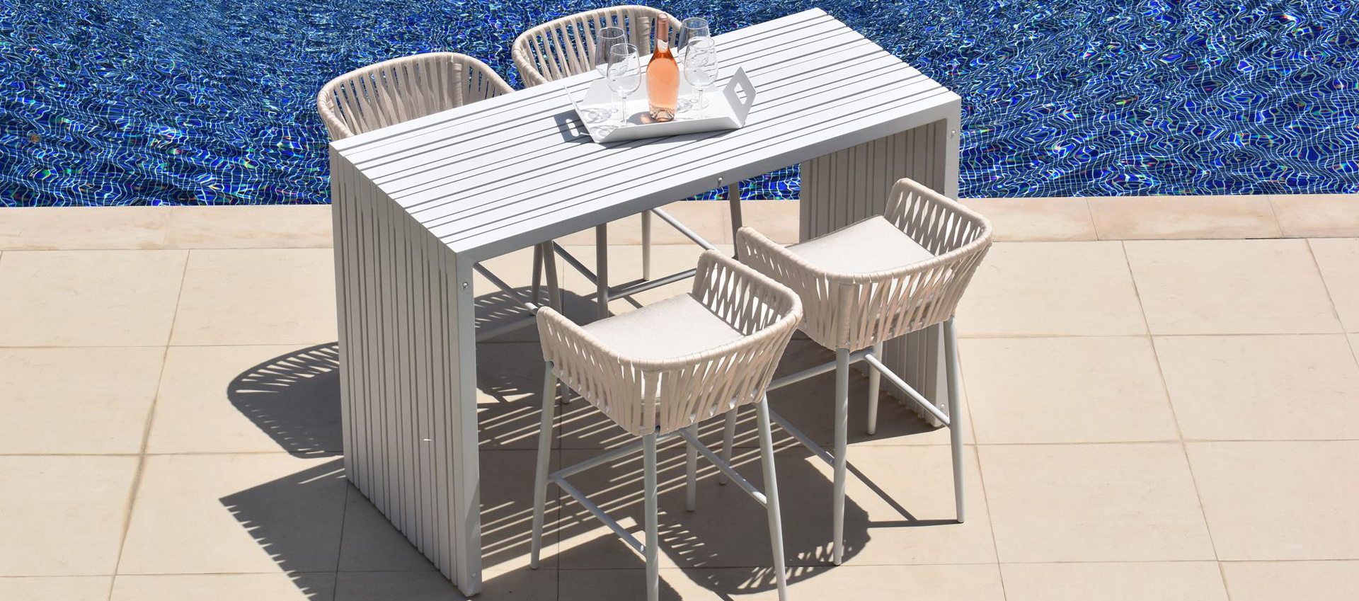 The Marina Rope Weave integrates flawless design with premium comfort. Our Marina Rope Weave is characterised by a combination of powder coated aluminium frames, braided UV stabilised polyester styled in a latticed rope weave and comfortable Sunproof fabric cushions. Designed to create dense braiding that still allows the circulation of air. The bar table is made from powder coated aluminium. The pieces can be tailored to suit many different projects, suitable for both outdoor or indoor use.
