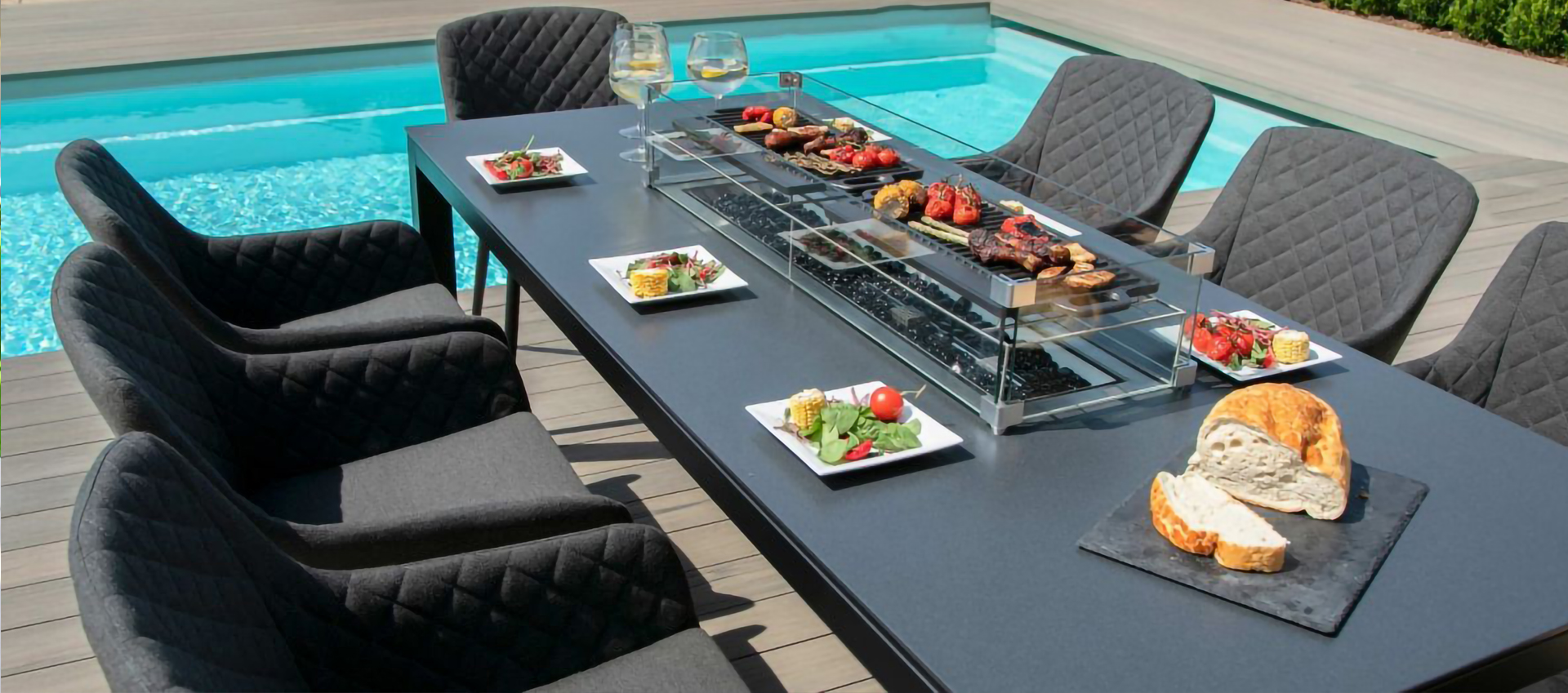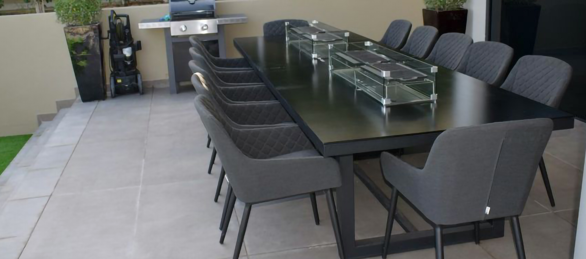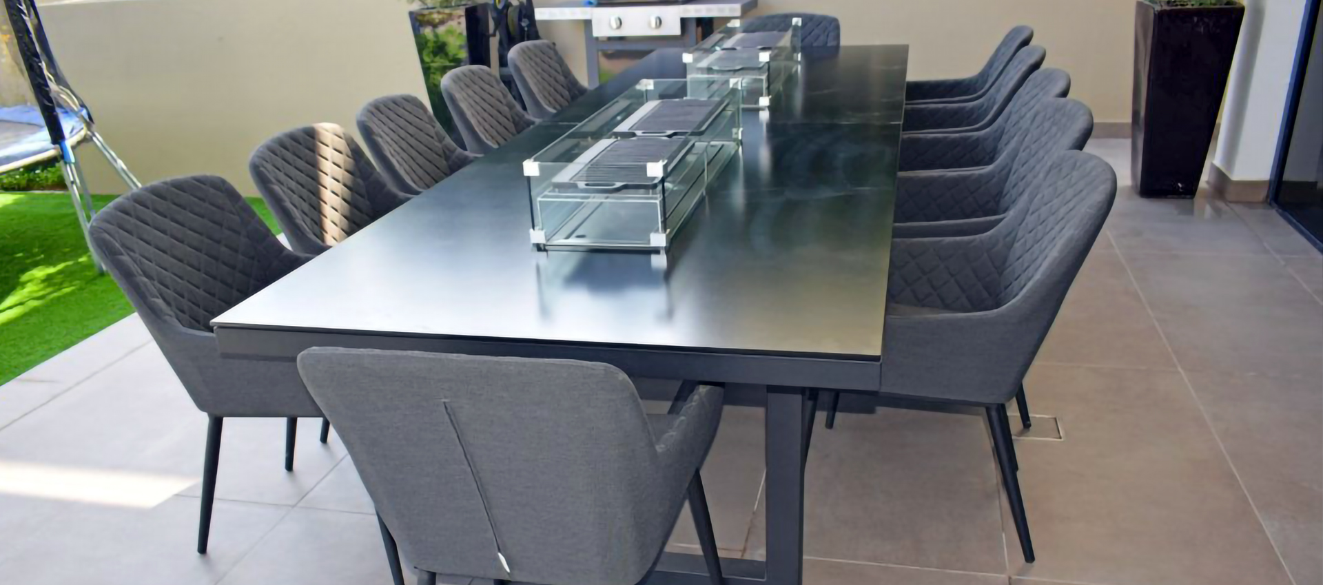 Maze Outdoor Fabric - Zest 12 Seat Dining with Double Firepit. This bespoke table features a double fire-pit and is a real showstopper and will be the envy of all your guests. Maze Outdoor Fabric looks and feel soft just like everyday indoor textiles, but their revolutionary construction makes them almost indestructible.