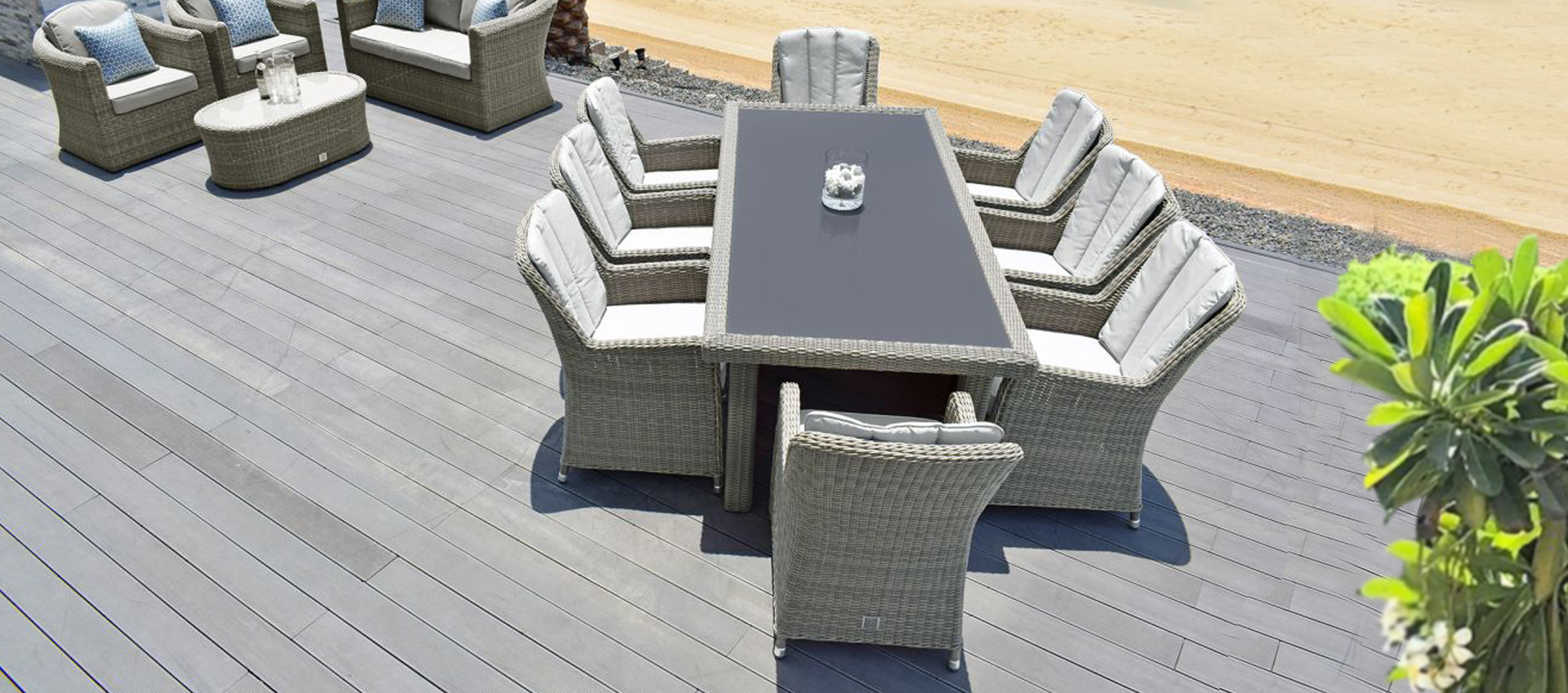 The classic yet elegant look of the Oxford Dining Chair Set makes it suitable for any outdoor dining occasion, whilst in ultimate comfort. The seats have wide arms, extra high back and generous base and back cushions. Entertaining outdoors has never been more luxurious with the Oxford Dining chair set, whilst also making a stunning addition to your garden. The table has a fully weaved edge complete with matching coloured toughened safety glass.