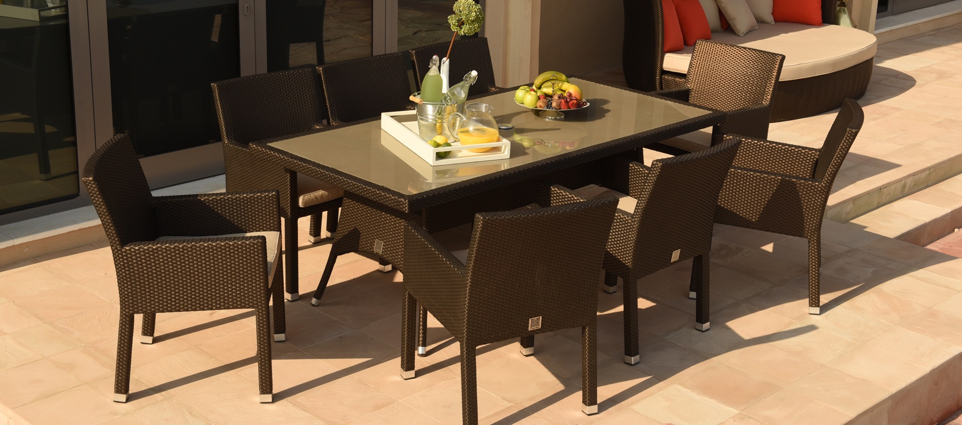 This 8 seat dining set set will turn your outdoor area into a luxurious retreat. This set is handwoven with UV treated REHAU Polyethylene wicker. The set is constructed with commercial grade powder-coated aluminium frames that will remain rust free. The set comes with a 1 year warranty against fading or corrosion for piece of mind. The table has fully woven legs and inset toughened safety glass with a frosted finish. The seats have wide arms, high back and generous base cushions. Entertaining outdoors has never been more luxurious.